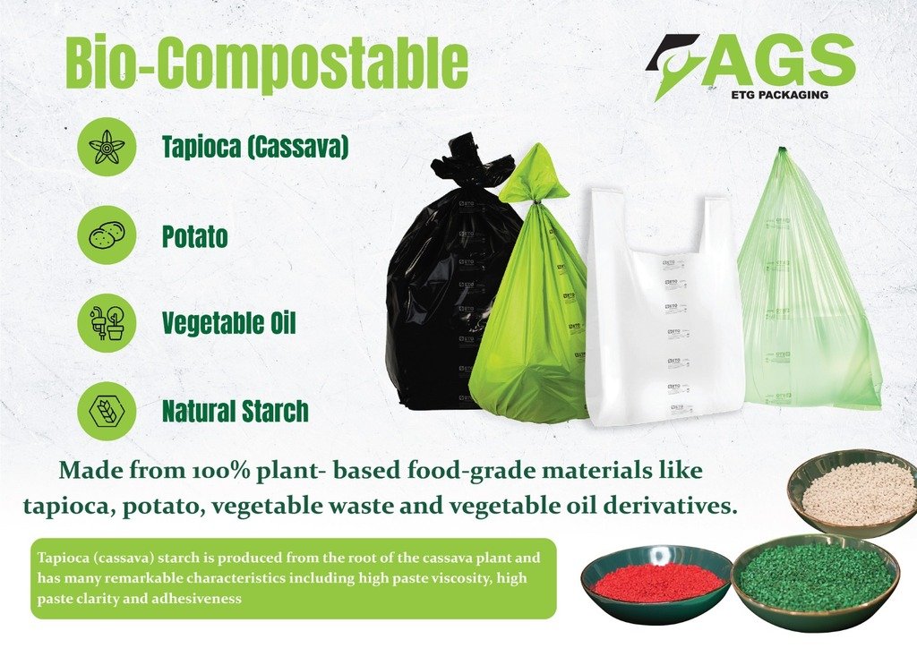 Our products are crafted from 100% plant-based food-grade materials such as tapioca (cassava), potato, vegetable oil, and natural starch. These materials are chosen for their eco-friendly properties, ensuring our products support a sustainable future. By utilizing renewable resources, we significantly reduce our reliance on fossil fuels and contribute to the circular economy.